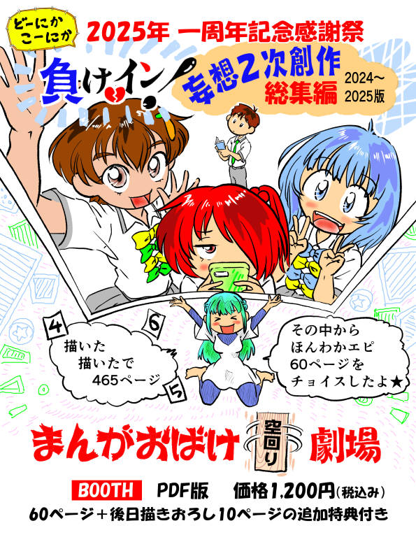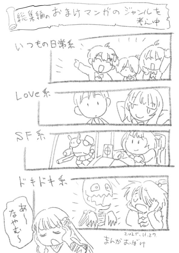 一周年記念の総集編まんがの、オマケまんがを考え中。