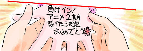 手のひらの文字 「makein!アニメ2期。製作決定おめでとう」