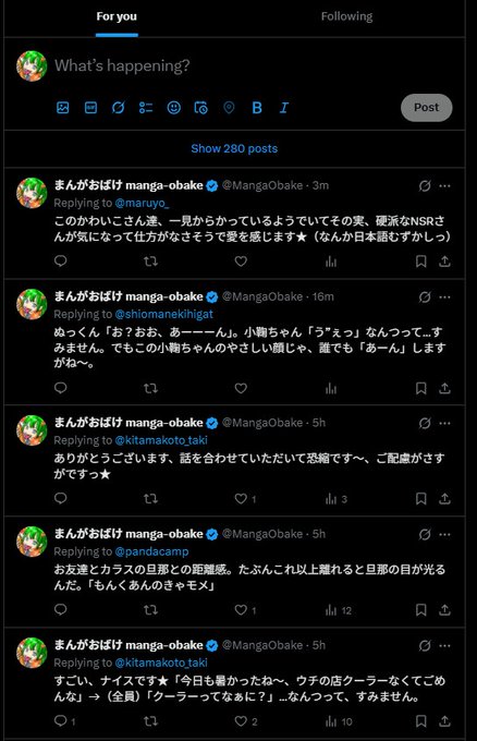 タイムラインのfor youが、自分で書いたコメばっかりになってる...世界でわししかXやってないみたいでうすら怖い…鏡を見せられているようで完全に素になってしもうた…き、今日はもうタイムライン見るのやめよう……そうだ、まっとうな人間にならなきゃ…。