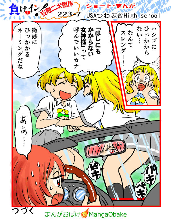 アングルは二つ書きました。 一つはリアトランク側に立っているものとボンネットに立っているものです。 前のページの流れから行くと、ボンネットに二人がいるのは つながりが変なのですが、構図として面白いのはこっちだったので採用しました。 最後までどっちにするか悩みましたが、 不自然でも面白さを優先したくなりますね。
