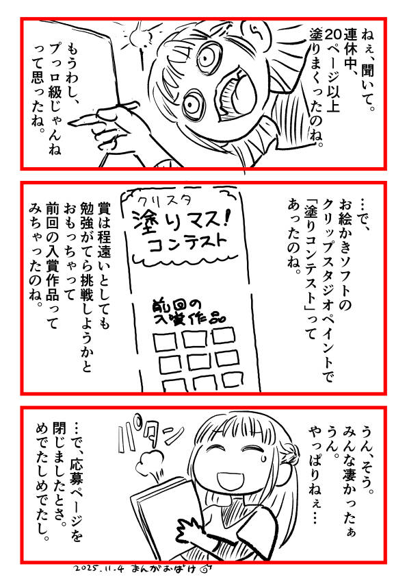 クリップスタジオペイントというお絵かきソフトでまんがをかいてます。